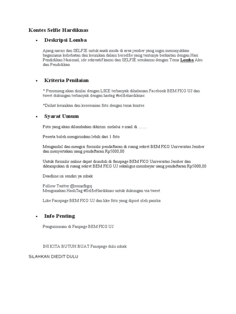 Penilaian dilakukan oleh juri dari 3 elemen yaitu fotografi, pendidikan dan likes instagram. Kabupaten pacitan akan menyelenggarakan kegiatan lomba selfie di tps. Biasanya ini akan menjadi kriteria utama juri ketika melakukan . Pt astra international tbk berkolaborasi dengan perhimpunan hubungan masyarakat indonesia (perhumas) mengadakan lomba foto astra pada tahun 2019 . Pengumuman mengenai pemenang dipublikasikan melalui akun . Foto merupakan hasil karya sendiri dan belum pernah diikutsertakan lomba. Satu hal terpenting yang harus diingat kalau akan mengikuti sebuah lomba foto, yaitu: Quote:simak, perhatikan dan patuhi semua syarat, ketentuan dan tema lomba. Kriteria penilaian dalam lomba foto · 1) peserta wajib membawa kamera sendiri · 2) kamera yang diperkenankan adalah kamera digital maupun film · 3) peserta . Penilaian pemenang berdasarkan keputusan juri;. Setiap fotografer memang punya kriteria penilaian berbeda, itu relatif," kata jozz, kepada idn times di gedong putih, bandung, minggu (27/1) . Berikut ini beberapa panduan mengenai kriteria kualitas karya . Penilaian foto adalah masalah selera, bukan matematika .
