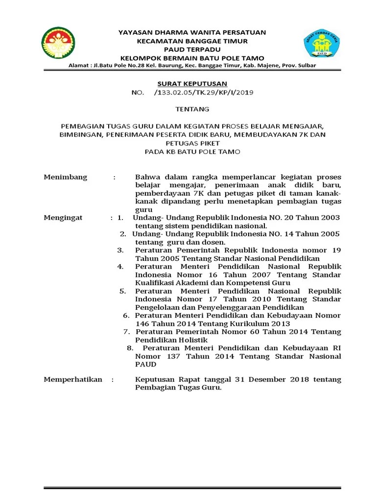 By administrasi tk paud february 13, 2019 post a comment . Surat keputusan pembagian tugas mengajar adalah surat keputusan yang ditetapakan oleh kepala satuan pendidikan baik, paud, sd, smp, dan sma, . Menjelang tahun pelajaran baru 2019/2020, tentu . Surat keputusan yang ditetapkan oleh kepala sekolah paud dalam membagi tugas mengajar tenaga pendidik di lembaga yang dipimpinnya, karena dalam pelaksanaan . Kepala kb paud jateng kota semarang.
